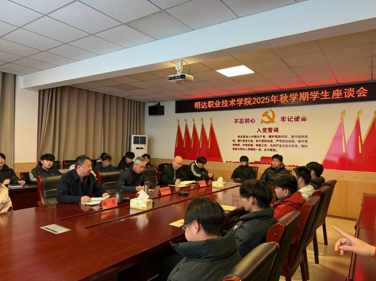 为搭建学校与学生之间高效沟通的桥梁,深入了解学生在学习与生活中的实际诉求,凝聚师生共建校园的合力,11月19日晚18:30,学工处在行政楼二楼分两场组织召开2025年秋学期新老生座谈会。两场座谈会分别聚焦老生的发展需求与新生的适应问题。校长马宏伟、副校长周凯猛、学工处处长朱军、学工行政人员以及各年级学生代表共同参与。会议由朱军处长主持,学生代表们结合自身经历,围绕校园生活的多个方面畅所欲言、积极建言。
